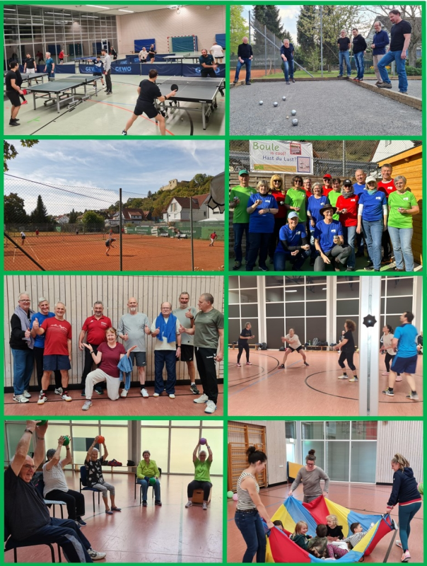 Jugendliche, Damen, Herren und Senioren können turnen und sich strecken, auf unseren Außenplätzen eine ruhige Boulekugel schieben oder gelbe Bälle schlagen. In der Halle kann man kleinen Plastikbällen hinterherjagen oder die Größeren baggern und pritschen.